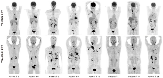 圖2. 18F-FDG和68Ga-FAPI PET/CT 在8例有代表性的mDTC患者中的MIP圖像