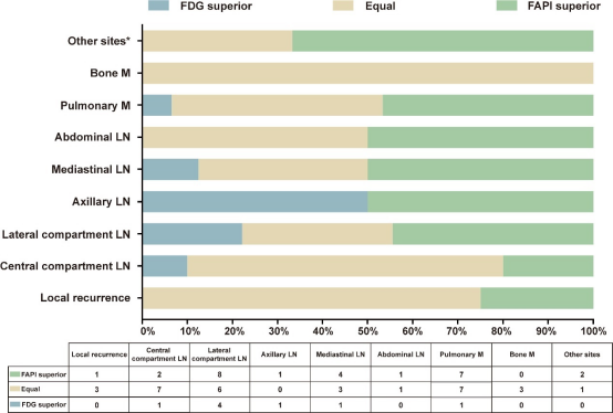 圖3. 68Ga-FAPI及18F-FDG PET/CT在局部復(fù)發(fā)、淋巴結(jié)轉(zhuǎn)移灶、結(jié)外病灶中檢測優(yōu)略性的視覺評分系統(tǒng)