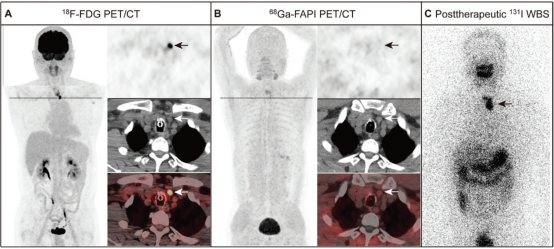 圖5. 女,26歲,甲狀腺乳頭狀癌術(shù)后、131I治療后1年,Tg水平呈進行性增高(最高101 ng/ml)。18F-FDG PET/CT提示雙頸散在小淋巴結(jié)(0.4-0.8cm),代謝不高;68Ga-FAPI PET/CT中頸部淋巴結(jié)顯像劑顯著高于18F-FDG(箭頭),考慮轉(zhuǎn)移淋巴結(jié)可能性大。該患者隨后行超聲引導(dǎo)下頸部淋巴結(jié)活檢,證實為甲狀腺癌轉(zhuǎn)移淋巴結(jié)。患者隨后行131I治療,RxWBS掃描中頸部轉(zhuǎn)移淋巴結(jié)未見明確131I攝取。