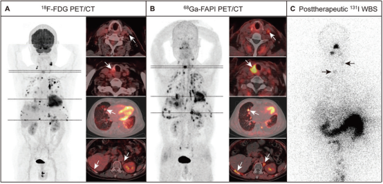 圖4. 18F-FDG PET/CT在甲狀腺癌局部復(fù)發(fā)伴全身多發(fā)轉(zhuǎn)移的68歲男性中示局部復(fù)發(fā),淋巴結(jié)、肺和胸膜轉(zhuǎn)移灶代謝輕-中度增高。68Ga-FAPI PET/CT示除上述病灶伴異常放射性攝取外,也檢測出更多的病灶。患者在隨后的RxWBS掃描中僅局部復(fù)發(fā)及頸部淋巴結(jié)輕度攝131I