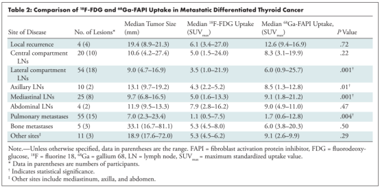 68Ga-FAPI與18F-FDG在mDTC中的攝取比較:相較于18F-FDG,68Ga-FAPI在肝臟、心臟、胃腸道及腦組織中本底更低??傮w而言,68Ga-FAPI在多數(shù)mDTC病灶中的SUVmax要明顯高于18F-FDG(7.03 vs 4.15;P<0.001)。特別是在頸部側(cè)頸區(qū)淋巴結(jié)、腋窩淋巴結(jié)、縱隔淋巴結(jié)及肺轉(zhuǎn)移灶中,68Ga-FAPI的SUVmax要顯著高于18F-FDG(圖2、表2)。