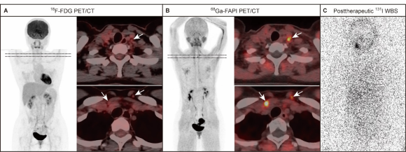甲狀腺癌是最常見的內(nèi)分泌惡性腫瘤。其中,分化型甲狀腺癌(DTC)是甲狀腺癌最主要的病理分型,對現(xiàn)有治療模式反應(yīng)好,具有良好的預(yù)后。131I治療后全身閃爍掃描(RxWBS)在篩查攝131I的DTC病灶的優(yōu)越性能使其在DTC臨床診療中有著不可撼動的位置。然而,5-15%的DTC以及50%的轉(zhuǎn)移性DTC(mDTC)最終將會發(fā)展為放射性碘難治性甲狀腺癌(RAIR-DTC)。因其失去131I親和性且侵襲性增強,預(yù)后較差。對于這部分患者,ATA指南推薦18F-FDG PET/CT進行疾病復(fù)發(fā)及轉(zhuǎn)移的評估。但18F-FDG PET/CT對于RAIR-DTC復(fù)發(fā)、轉(zhuǎn)移灶診斷敏感性的變異較大,且在甲狀腺球蛋白(Tg)進行性增高而碘掃陰性的這類患者中存在假陰性,使得mDTC的診療更加復(fù)雜。