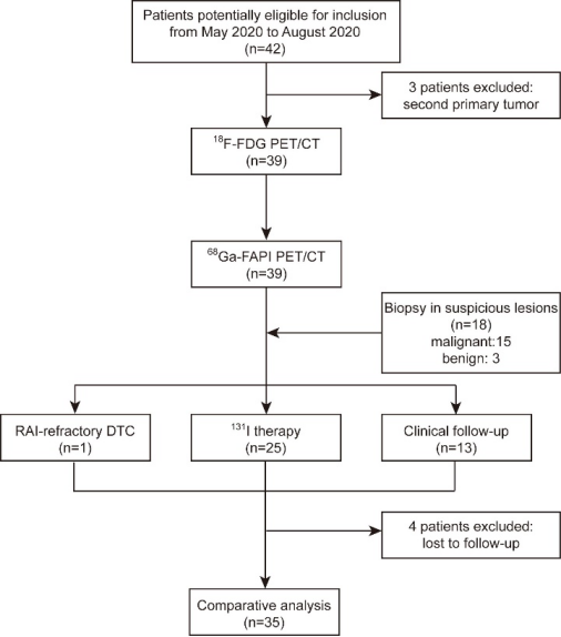 研究過程:符合入組要求且接受常規(guī)影像學(xué)檢查(頸部超聲、胸部CT、MRI)后,在入組后一周內(nèi)完成68Ga-FAPI PET/CT與18F-FDG PET/CT檢查,患者在已完成的影像學(xué)檢查中如有陽性病灶發(fā)現(xiàn),則接受131I治療,如治療后確診為RAIR-DTC,與患者溝通后按意愿進行TSH抑制治療、靶向治療或局部介入治療。而對于影像學(xué)陰性或已確診為RAIR-DTC的患者則繼續(xù)在標(biāo)準(zhǔn)治療流程下進行隨訪(TSH抑制治療或靶向治療)。隨訪時間至少為1年,最后根據(jù)參考標(biāo)準(zhǔn)進行診斷效能評判。