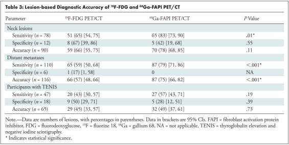表3. 68Ga-FAPI與18F-FDG基于病灶的診斷準(zhǔn)確性