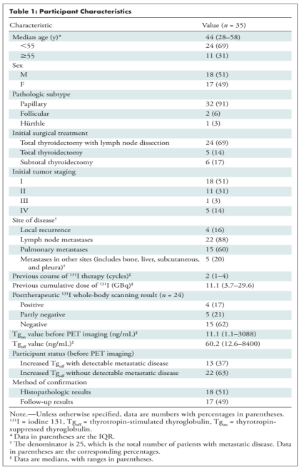 納排標(biāo)準(zhǔn):在該研究中,納入了①既往手術(shù)病理確診DTC并接受了131I消融;②隨訪過程中刺激性Tg增高(Tg≥10ng/mL)且球蛋白抗體陰性;③PET掃描前未接受任何治療措施的病人。懷孕或哺乳期、有第二原發(fā)腫瘤、Tg陰性的患者排除出該研究。