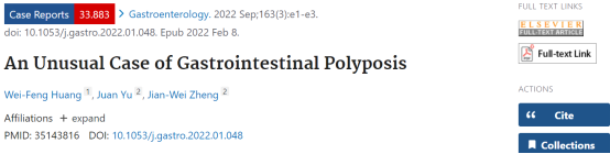 3. Wei-Feng Huang, Juan Yu, Jian-Wei Zheng. An Unusual Case of Gastrointestinal Polyposis. Gastroenterology. 2022;163(3):e1-e3. 1區(qū)IF: 33.883