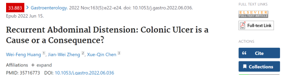 1. Wei-Feng Huang, Jian-Wei Zheng, Xue-Qin Chen. Recurrent Abdominal Distension: Colonic Ulcer is a Cause or a Consequence? Gastroenterology. 2022;163(5):e22-e24. 1區(qū)IF: 33.883