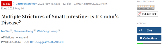 2. Na Wu, Shao-Kun Hong, Wei-Feng Huang. Multiple Strictures of Small Intestine: Is It a Crohn’s Disease? Gastroenterology. 2022;163(5):e1-e2. 1區(qū)IF: 33.883