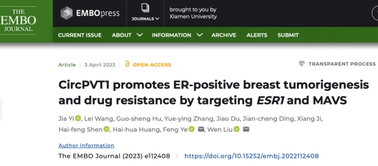 2023年4月3日,廈門大學(xué)附屬第一醫(yī)院葉峰課題組與廈門大學(xué)劉文課題組聯(lián)合在在中科院1區(qū)TOP期刊The EMBO Journal(IF:14.05)雜志上發(fā)表題為“CircPVT1 promotes ER-positive breast tumorigenesis and drug resistance by targeting ESR1 and MAVS”的研究成果。該研究發(fā)現(xiàn),環(huán)狀RNA circPVT1在乳腺癌中高表達(dá),通過靶向ESR1 mRNA和MAVS蛋白雙重作用機(jī)制促進(jìn)乳腺癌發(fā)生發(fā)展。
