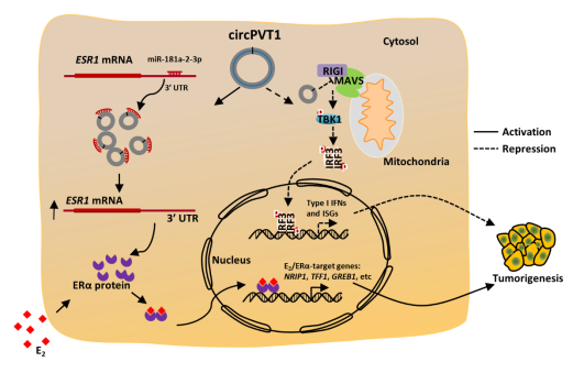 模式圖:CircPVT1競(jìng)爭性結(jié)合miR-181a-2-3p促進(jìn)ESR1表達(dá)以及結(jié)合MAVS抑制I型干擾素通路激活,促進(jìn)ER陽性乳腺癌發(fā)生發(fā)展的雙重作用機(jī)制。