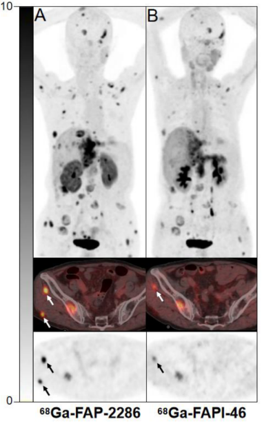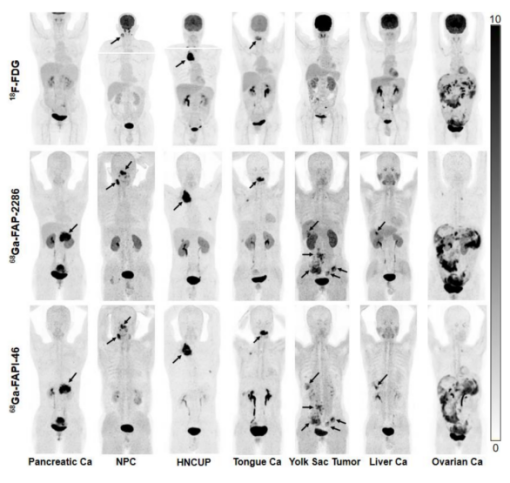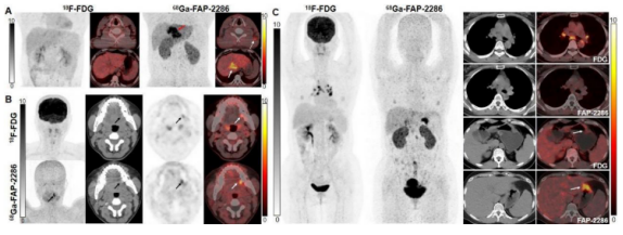 圖4. 68Ga-FAP-2286與18F-FDG對(duì)比的代表性圖像;