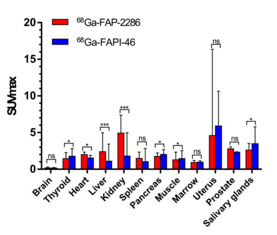 圖2 . 68Ga-FAP-2286和68Ga-FAPI-46在正常器官中的生物分布結(jié)果(n=19)
