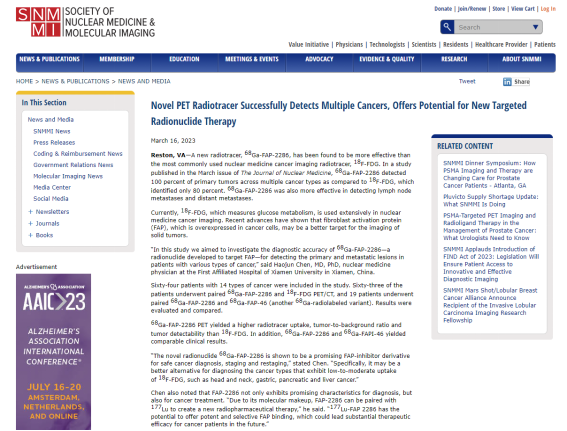 同時(shí)間,該研究被SNMMI網(wǎng)站作為TOP story報(bào)告進(jìn)行推薦“Novel PET Radiotracer Successfully Detects Multiple Cancers, Offers Potential for New Targeted Radionuclide Therapy(新型PET示蹤劑成功檢測出多種癌癥,為靶向核素內(nèi)照射治療提供了新策略)”。