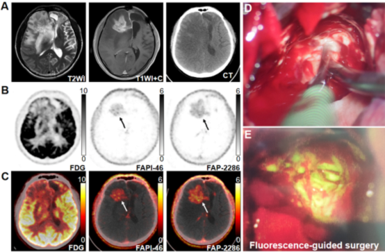 圖5. 男,44歲,膠質(zhì)母細(xì)胞瘤術(shù)后1年,MRI提示右側(cè)額葉術(shù)區(qū)異常信號(hào),考慮腫瘤復(fù)發(fā)可能。該患者行18F-FDG PET/CT檢查,但右額葉術(shù)區(qū)未見異常高代謝病灶。隨后行68Ga-FAPI-46及68Ga-FAP-2286 PET/CT顯像,在右額葉術(shù)區(qū)均可見異常顯像劑濃聚灶,與MRI提示異常信號(hào)范圍一致。此外,68Ga-FAP-2286 PET/CT顯示出較68Ga-FAPI-46更高的腫瘤攝?。?/span>SUVmax 4.2 vs. 2.7)及靶/本底比(TBR 70 vs. 45)。該患者隨后行手術(shù)切除,病理證實(shí)為膠質(zhì)母細(xì)胞瘤復(fù)發(fā)。