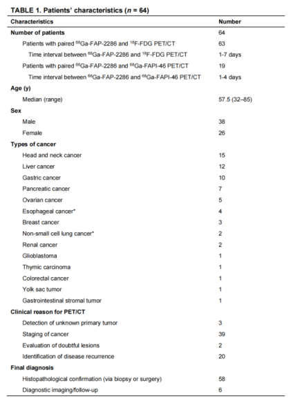 64例腫瘤患者中(包括15種不同類型惡性腫瘤),44例為初診分期、20例為治療后復(fù)發(fā)/轉(zhuǎn)移患者。64例腫瘤患者中,63例同期接受18F-FDG PET/CT顯像進(jìn)行對(duì)照(顯像時(shí)間間隔為1-7天),19例接受68Ga-FAPI-46 PET/CT顯像進(jìn)行對(duì)照(顯像時(shí)間間隔為1-7天)。
