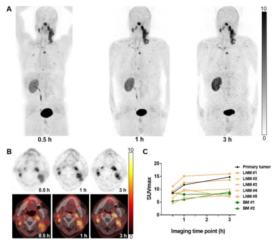 圖3. 一例鼻咽癌初診分期的66歲男性患者,在注射68Ga FAP-2286 PET/CT后的多個(gè)時(shí)間點(diǎn)進(jìn)行了PET/CT成像(0.5h、1h、3h)。PET/CT顯像結(jié)果提示:在鼻咽癌的原發(fā)病灶和轉(zhuǎn)移淋巴結(jié)中都觀察到了快速且穩(wěn)定的顯像劑攝取,3H延遲顯像中腫瘤攝取持續(xù)增高。定量分析顯示,大多數(shù)病灶的SUVmax隨時(shí)間持續(xù)上升。