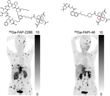 將基于喹啉結(jié)構(gòu)的小分子FAP抑制劑改構(gòu)為具有環(huán)狀結(jié)構(gòu)的多肽,有望增加FAPI探針在血液中的穩(wěn)定性并提高其受體靶向親和力。基于此,該研究團(tuán)隊(duì)首次系統(tǒng)性探索了靶向FAP的新型環(huán)肽放射性探針68Ga-FAP-2286在多種實(shí)體瘤中的臨床應(yīng)用,并與18F-FDG及68Ga-FAPI-46進(jìn)行了對(duì)比。