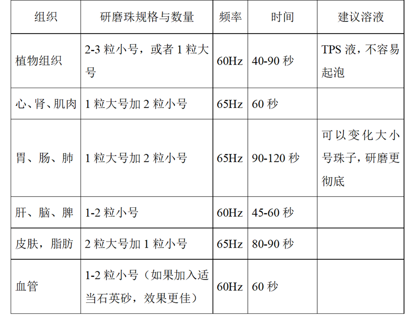 蛋白質(zhì)提取時(shí),建議頻率設(shè)定在60 Hz,研磨時(shí)間較RNA提取的研磨時(shí)間延長30秒左右,具體的研磨時(shí)間需要看研磨的組織量和類型而定,容易研磨的如:肝、腦、脾,用2粒4 mm珠子,研磨45秒;難研磨的如:心、腎、肌肉,使用2 mL離心管,放入4 mm以上的大珠子1-2粒,加3 mm的小珠子1-2粒,研磨60秒。研磨時(shí)加入提取液。