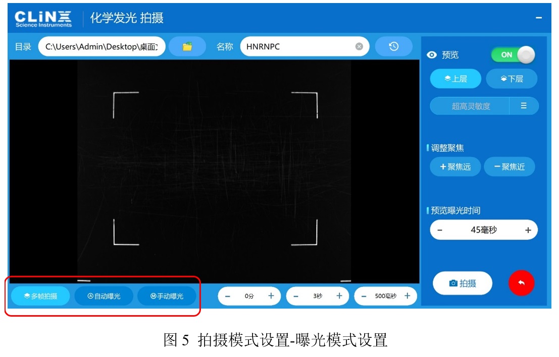 5、點(diǎn)擊“拍攝”進(jìn)行曝光,一般先點(diǎn)擊自動曝光,觀察成像效果,若不理想可進(jìn)行手動調(diào)節(jié)曝光,圖片曝光可支持多幀拍攝(三種方式:“灰度累積”、“自定時間”及“時間累積)(圖5)。