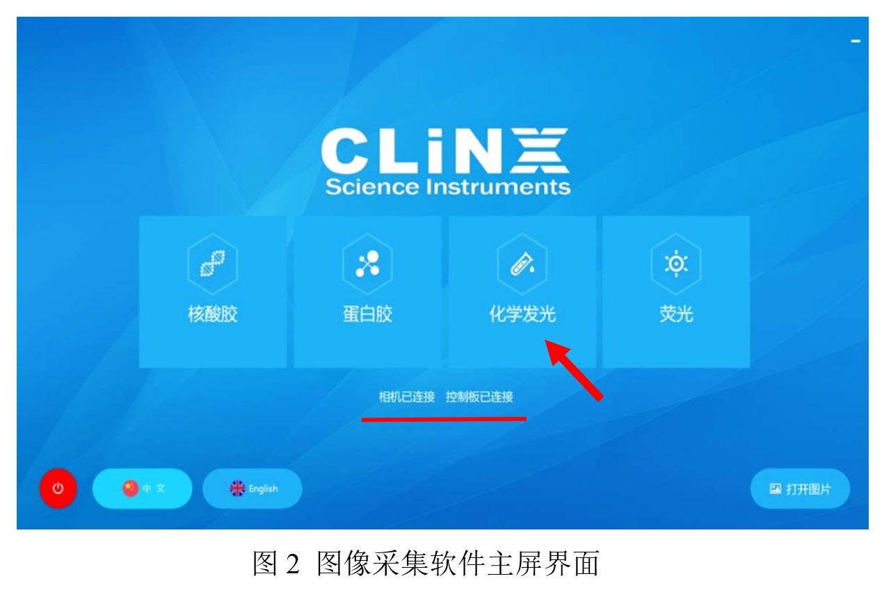 2、雙擊電腦桌面“ChemiScope Capture圖像采集系統(tǒng)”程序,顯示主界面(圖2),待出現(xiàn)“相機(jī)已連接,控制板已連接”,點(diǎn)擊“化學(xué)發(fā)光模塊”。