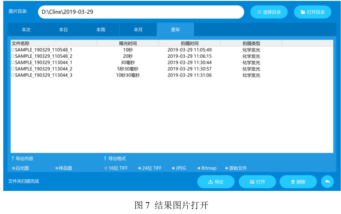 點(diǎn)擊“打開圖片”,可以根據(jù)“本次”、“本日”、“本周”、“本月”或“更早”找到系統(tǒng)已拍攝過的圖像。軟件也可以打開包括TIFF、JPG、BMP等格式在內(nèi)的圖像文件。