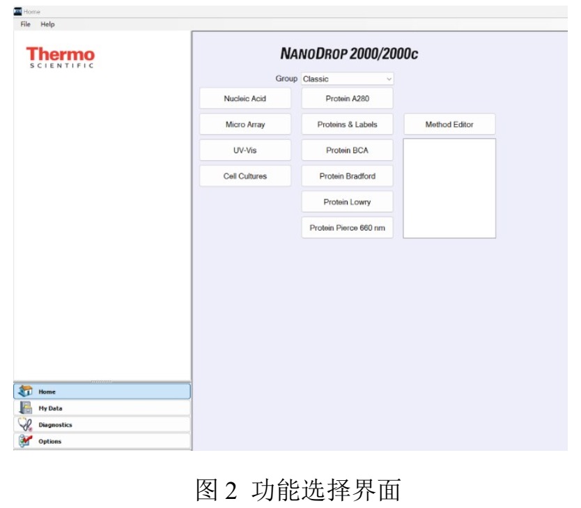 2、選擇檢測(cè)功能,如Nucleic Acid、Protein A280、UV-Vis等(圖2)。