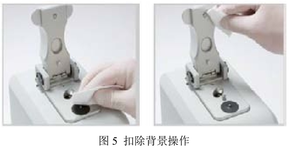 5、加樣完畢后,放下儀器上臂:點(diǎn)擊軟件左上角的Blank圖標(biāo)。大約5秒后,Measure按鍵由灰色變亮后,才可以抬起上臂,用無塵紙把上下基座擦拭干凈,如圖5所示。若需重新校零,可點(diǎn)擊左上角的Re-Blank圖標(biāo)重復(fù)步驟5。