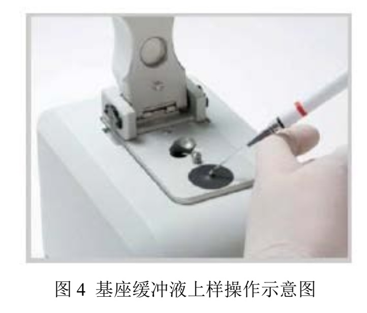 4、儀器校零,抬起儀器上臂,加樣品的緩沖液1 ul或2 ul到儀器的下基座上,如下圖所示(圖4)。