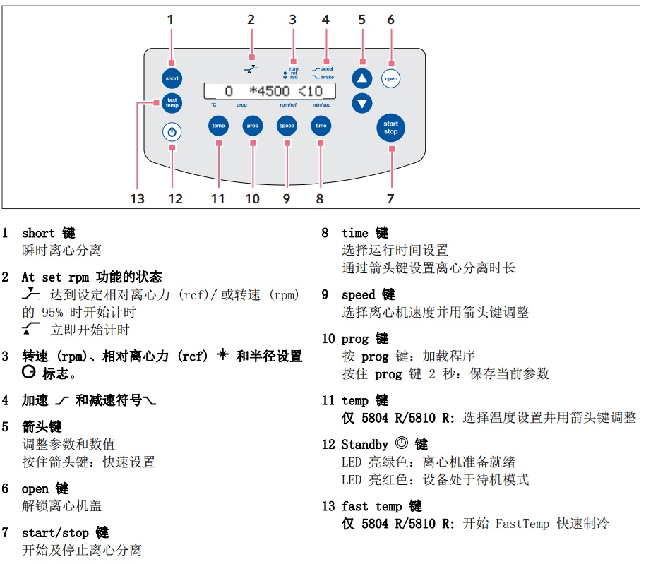 4、相對離心力(rcf)設置:反復按“speed”按鍵,直到顯示離心力符號“*”,利用上、下箭頭調節(jié)數值進行設定。