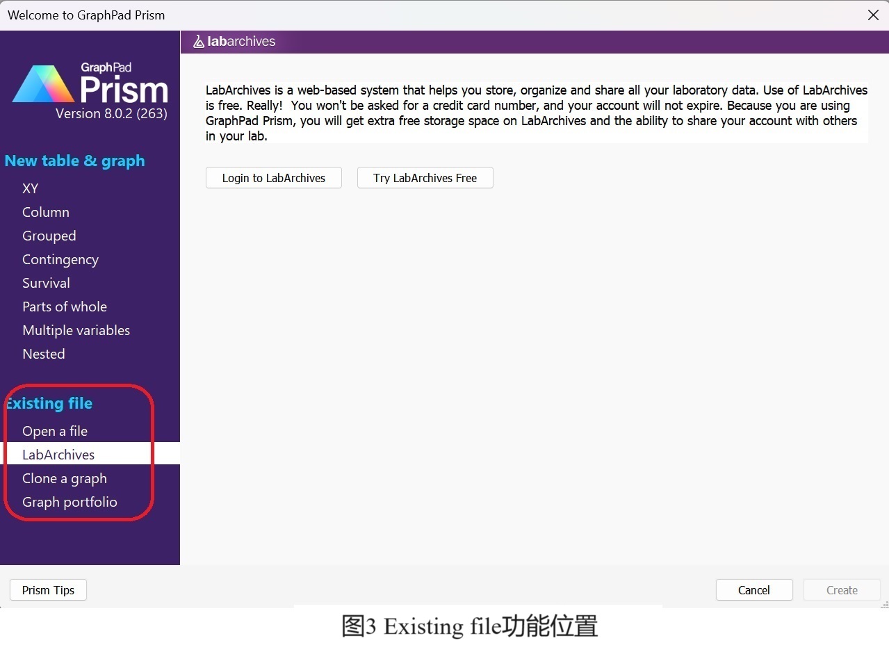 Existing file為打開已有文件,軟件提供了4個打開渠道,包括打開電腦本地文件、打開LabArchives文件、克隆圖表、組合圖表(圖3)。