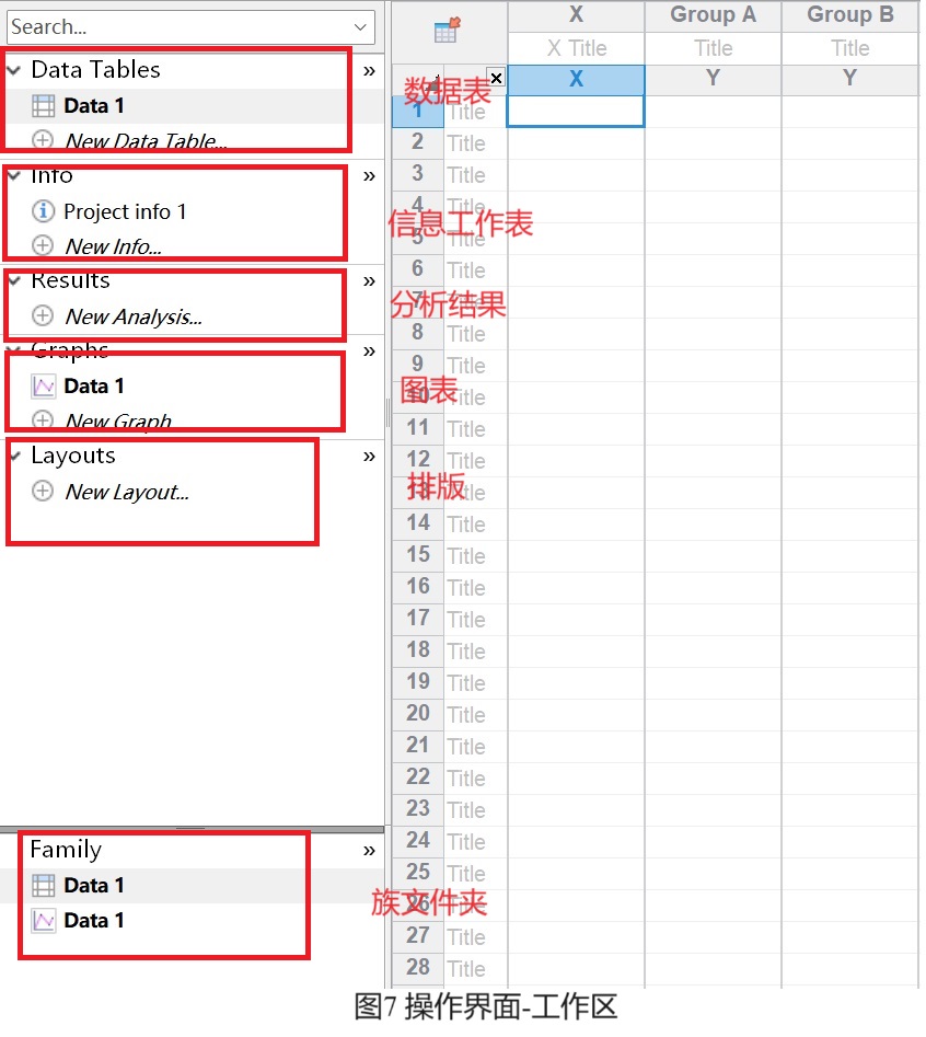 導航欄上部分分為:Data Tables (數據表)、Info (信息表)、Results (結果)、Graphs (圖片)、Layouts (排版);下部分為Family(族文件夾)。