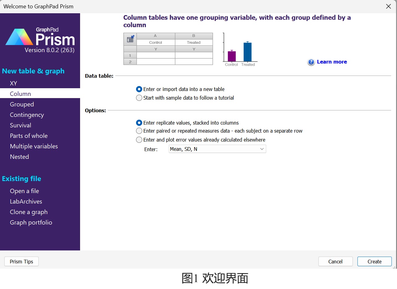 打開GraphPad軟件,首先會顯示歡迎界面(圖1)。