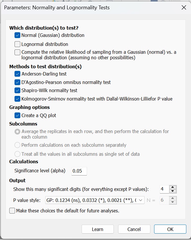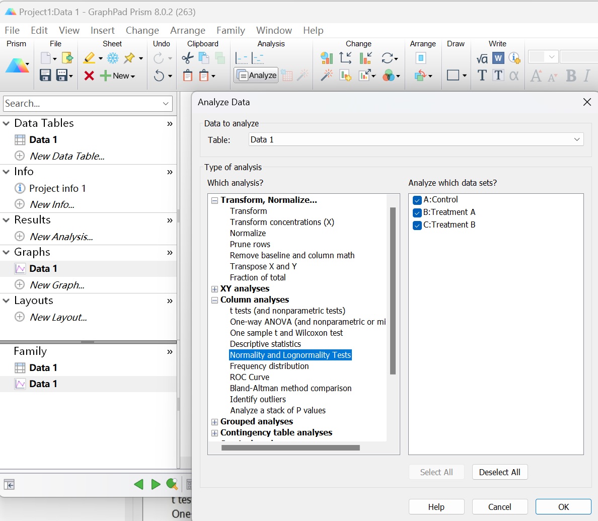 (1)確定數(shù)據(jù)是否符合正態(tài)分布,點(diǎn)擊Analysis,選擇Column analyses,選擇Normality and Lognormality Tests,即正態(tài)性檢驗(yàn)。(圖10-11)