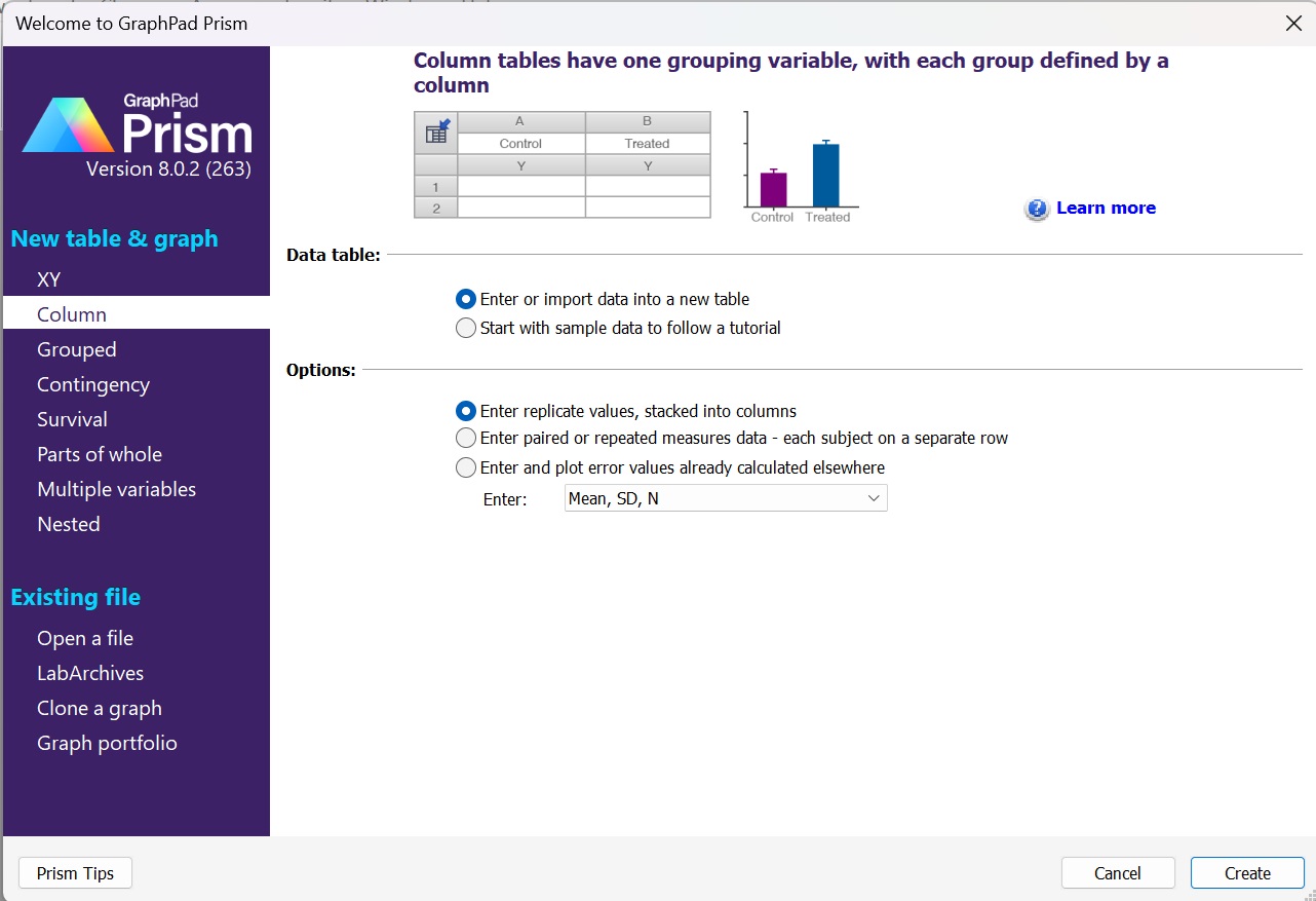 1、打開(kāi)Graphpad Prism軟件,選擇New table & graph-Column-Create創(chuàng)建新圖表。(圖1)