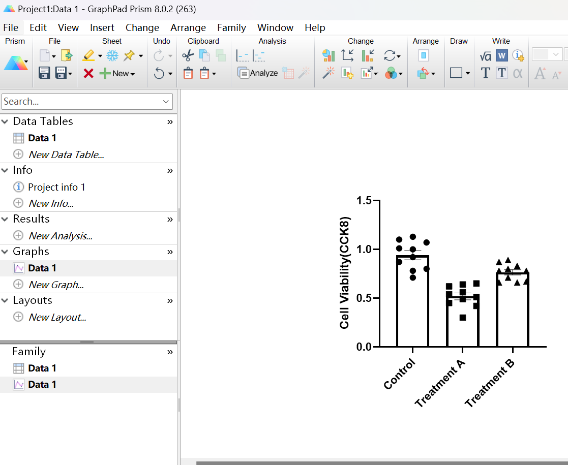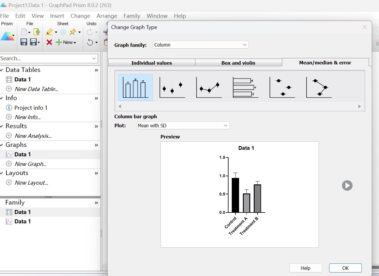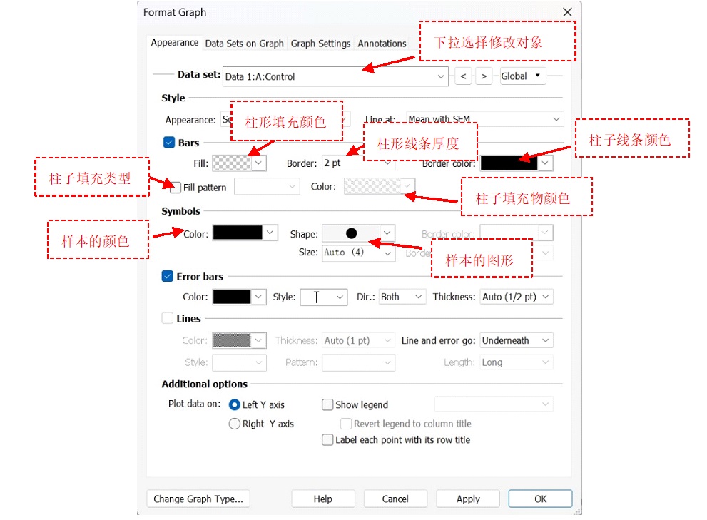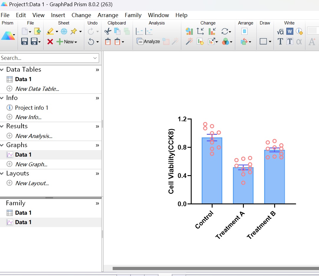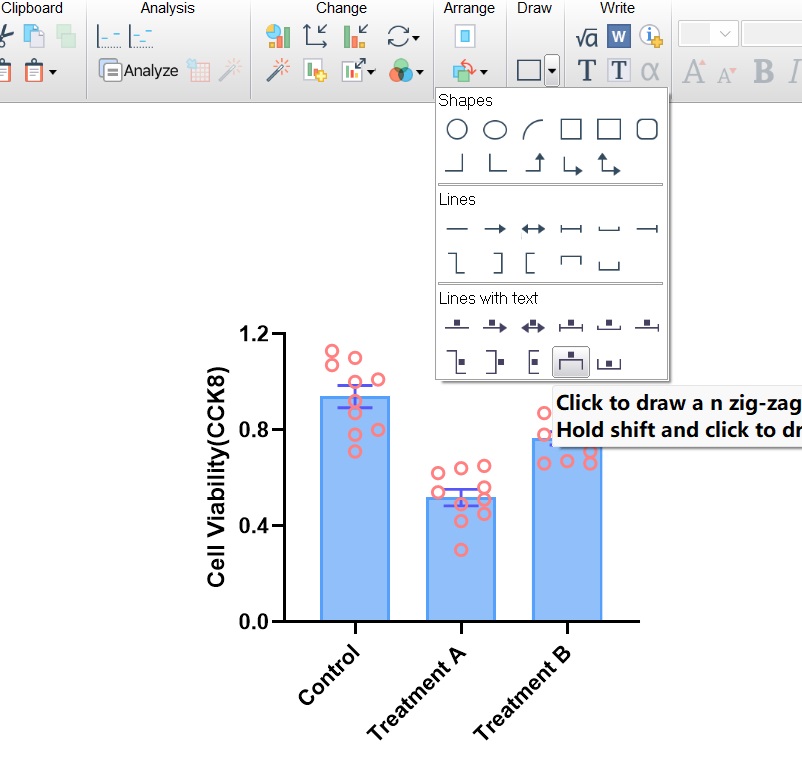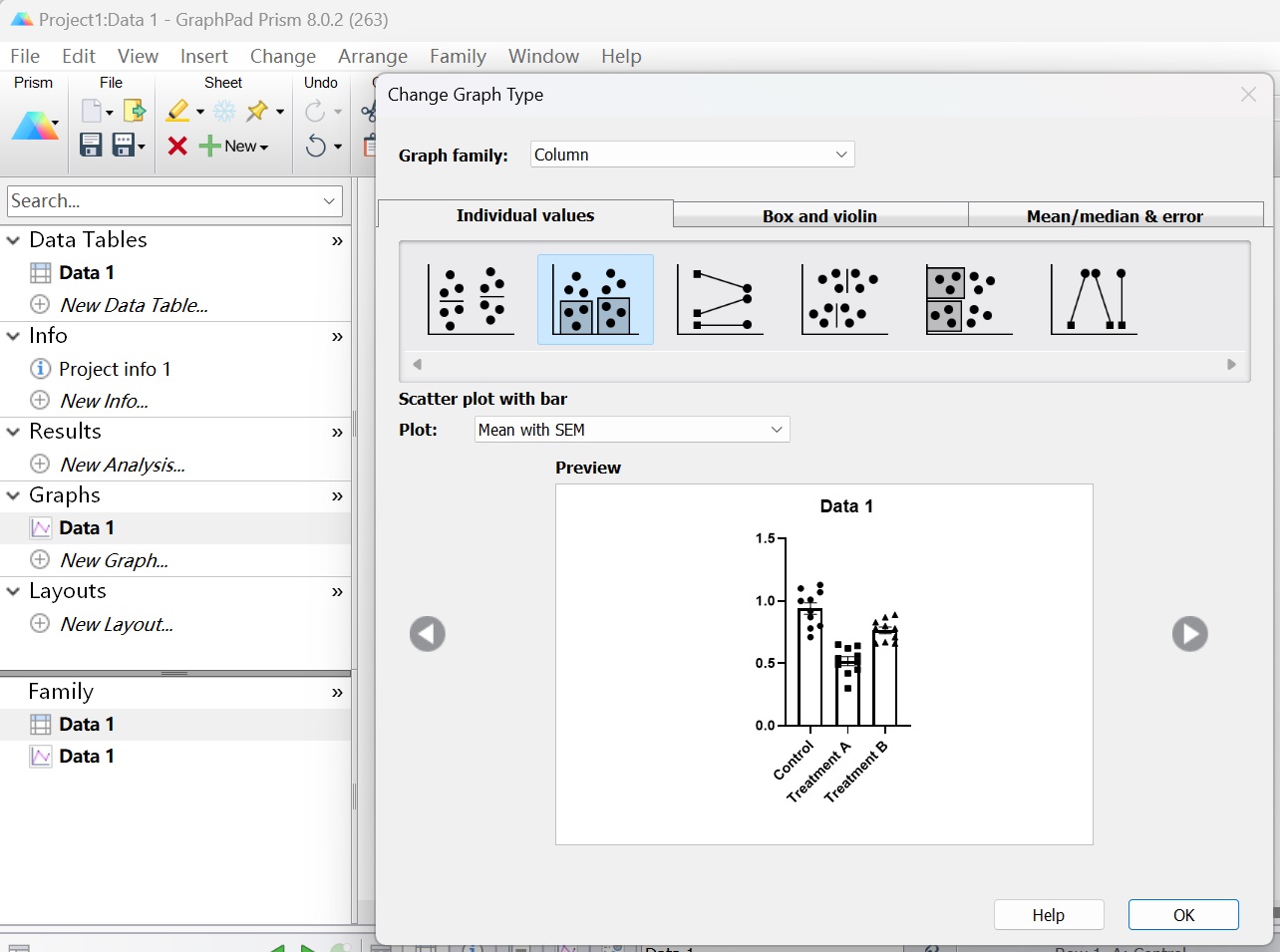 選擇合適的圖形,圖形有Individual values,Box and violin,Mean/median & error,可以選擇想要的圖形,這里選擇Individual values中的第二個(gè),如下圖(圖4);plot選擇“mean with SEM”(均數(shù)加減標(biāo)準(zhǔn)誤)。