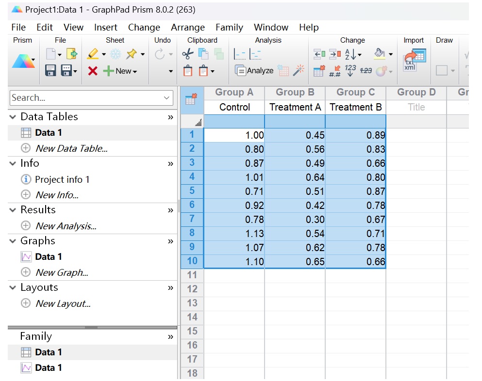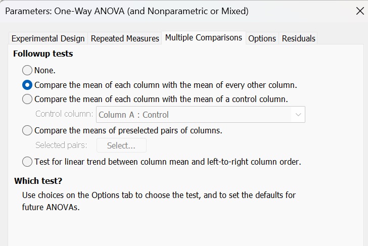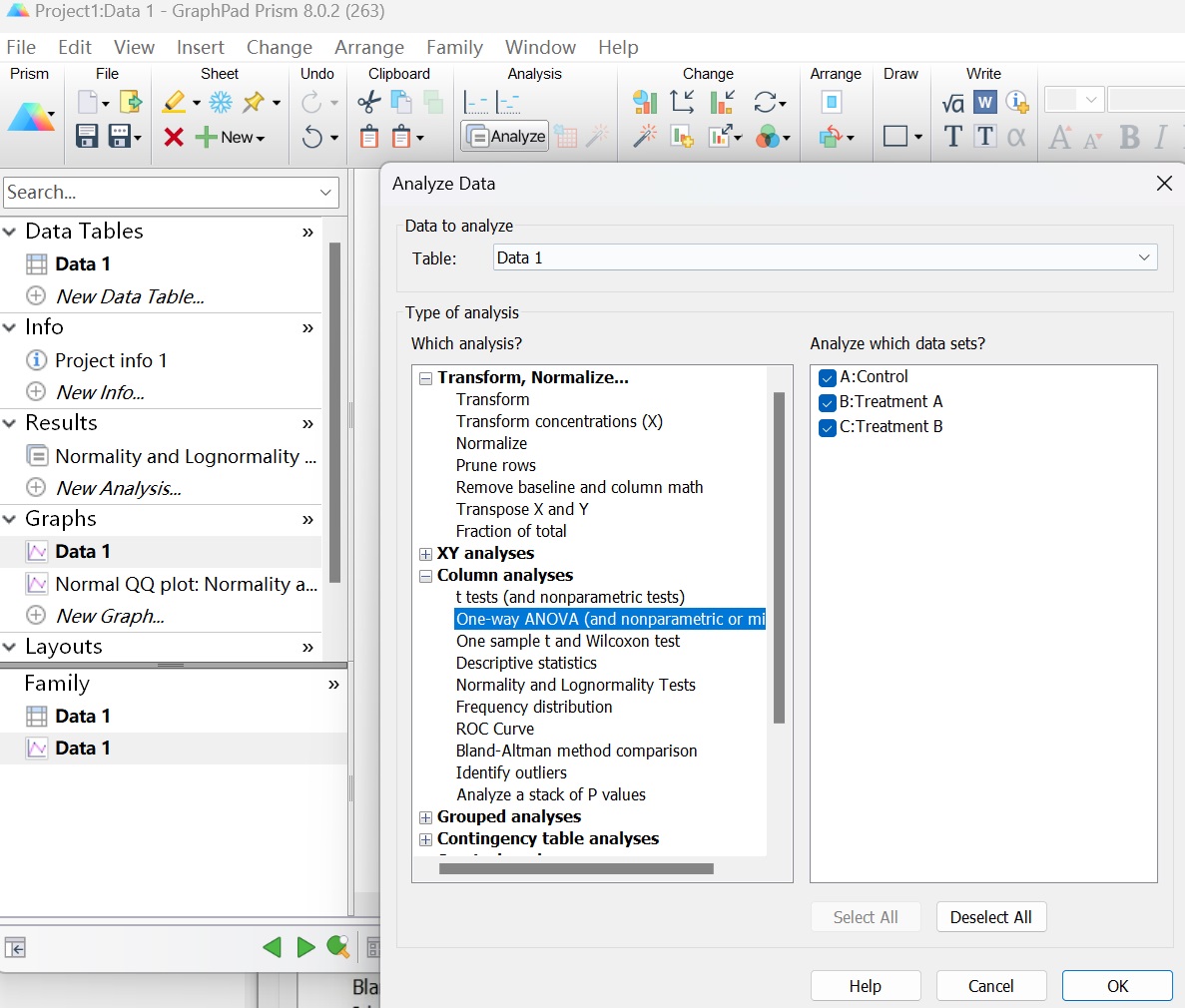 (2)點(diǎn)擊Data1,點(diǎn)擊Analysis,選擇Column analyses,選擇One-way ANOVA(and nonparametric or mixed)即單因素方差分析。(圖13-15)