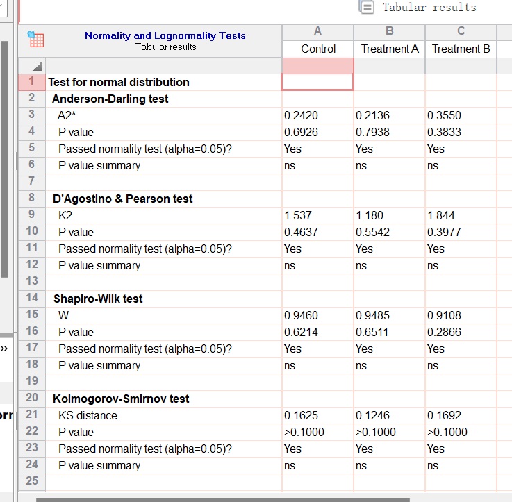 分析正態(tài)分布檢測(cè)結(jié)果,若P>0.05時(shí),數(shù)據(jù)符合正態(tài)分布。這里有幾個(gè)檢測(cè),都滿足了正態(tài)分布,可以考慮用參數(shù)檢驗(yàn)中的One-way ANOVA檢驗(yàn)(如果不滿足,則選擇非參數(shù)檢驗(yàn))。(圖12)