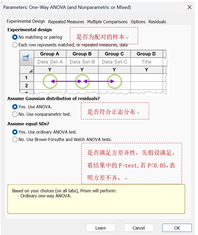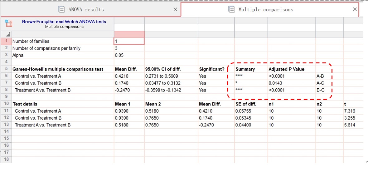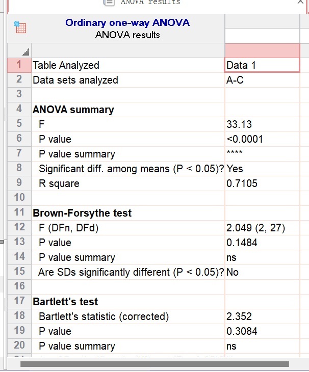 觀察結(jié)果,若P值>0.05,滿足方差齊性。(注意,如果不符合方差齊性,需要重新在equal SDs選擇Brown Forsythe and welch ANOVA test矯正,再重復(fù)進(jìn)行分析)。(圖16)