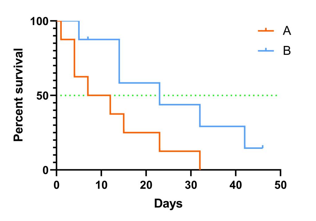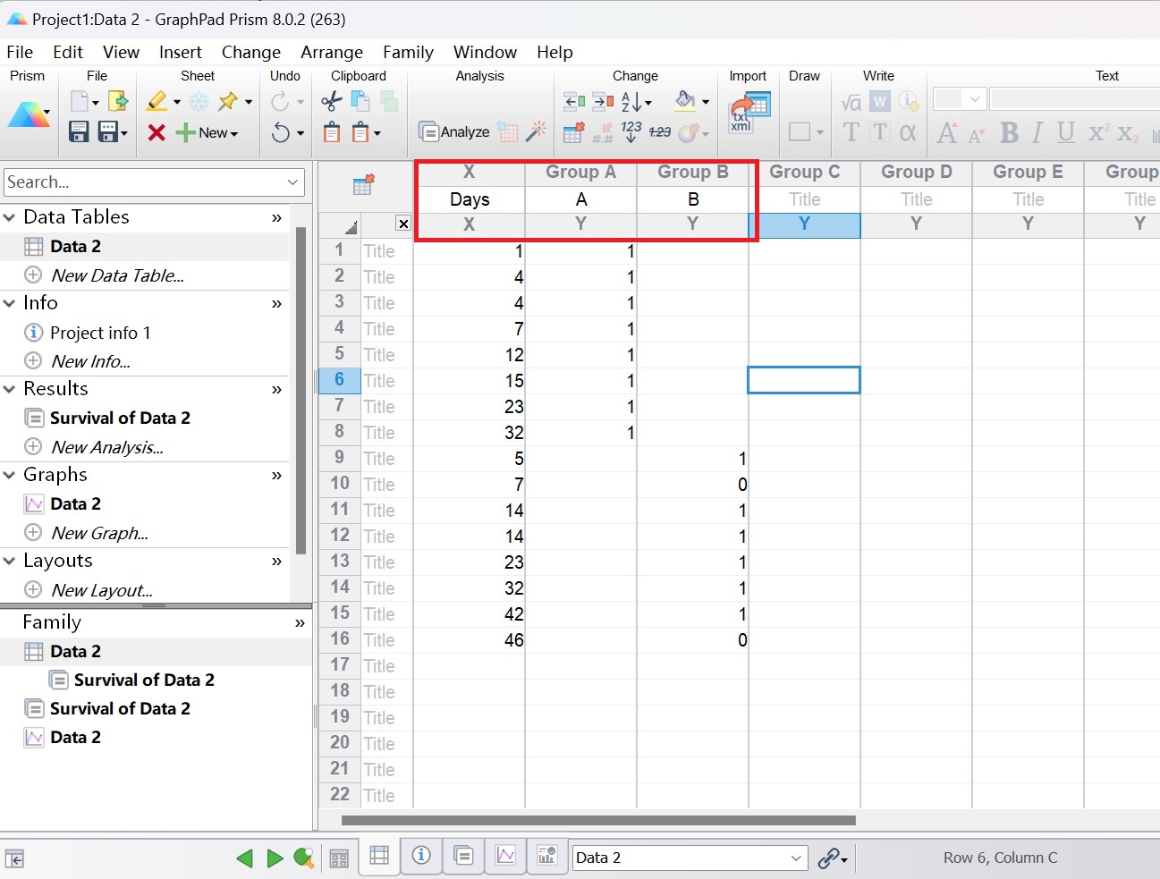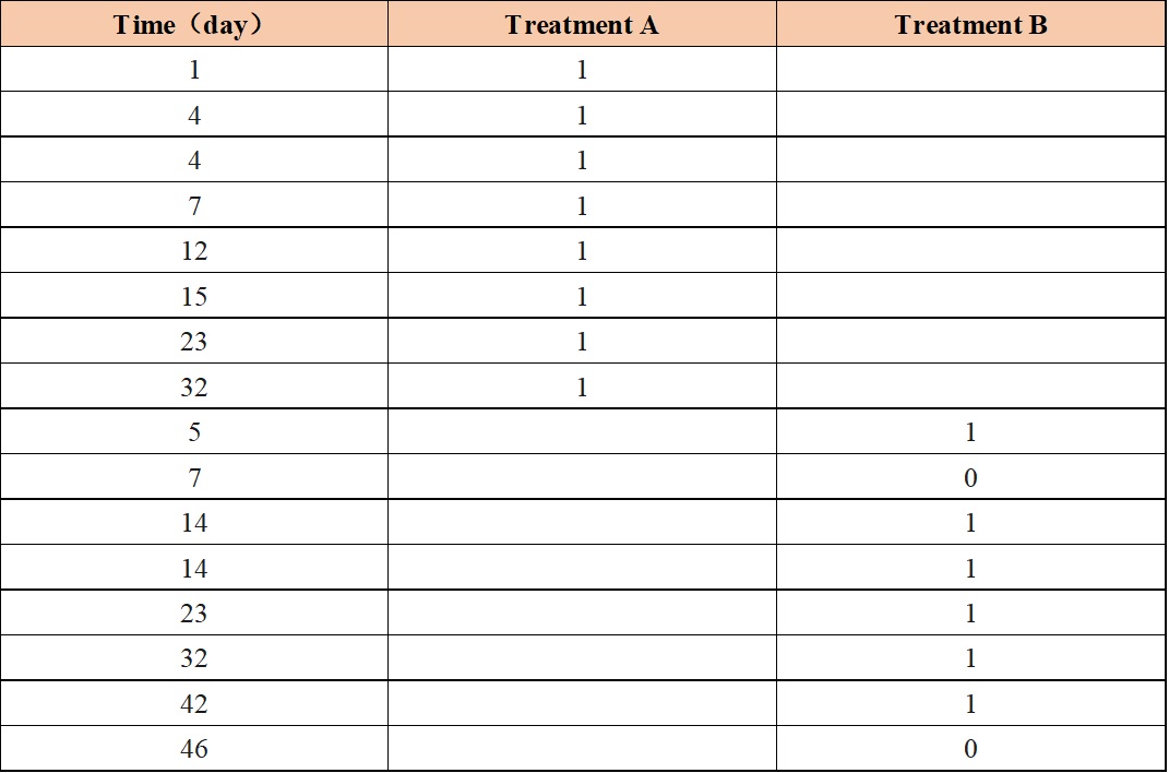 生存曲線(又稱Kaplan-Meier曲線)是用于描述生存狀況的圖形。圖形中,生存時間的數(shù)據(jù)類型分為完全數(shù)據(jù)和截尾數(shù)據(jù)。完全數(shù)據(jù)為從起點至死亡時間(死亡原因是所研究疾?。┧?jīng)歷的時間,用“1”表示;截尾數(shù)據(jù)(刪失數(shù)據(jù))為從起點至截尾點所經(jīng)歷的時間(刪失數(shù)據(jù)多由于失訪、死于與研究無關(guān)疾病、觀察結(jié)束時個體尚存活等),用“0”表示。根據(jù)下列范例數(shù)據(jù)(范例數(shù)據(jù)為隨機數(shù)據(jù),無生物學(xué)意義),利用GraphPad Prism軟件繪制生存曲線。