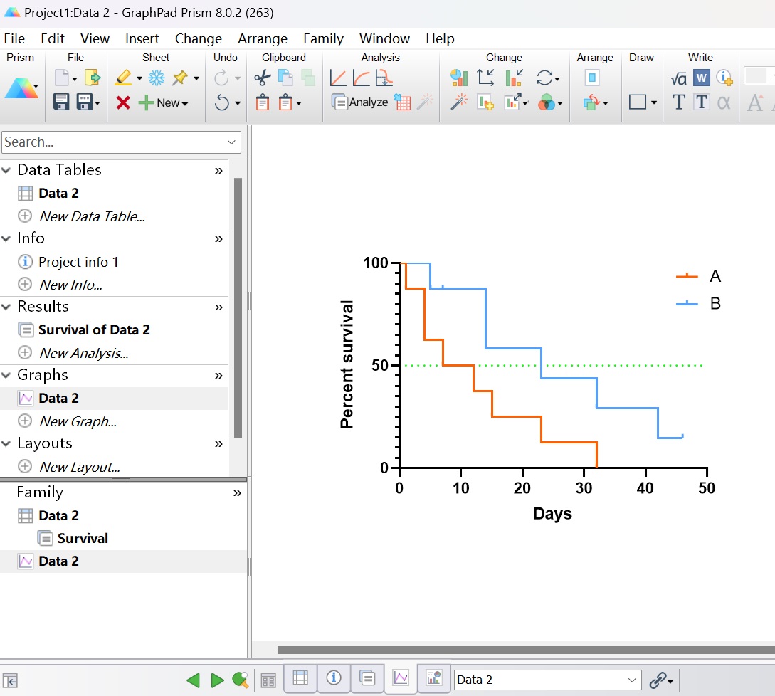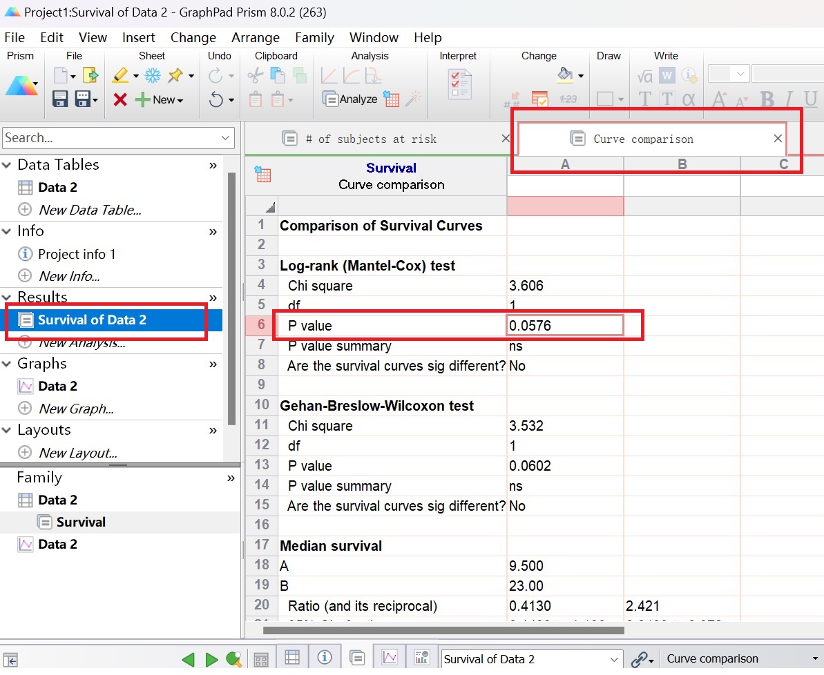 6、生存曲線結(jié)果分析:點擊導(dǎo)航欄Results下“Survival of Data2”選項即可對兩組的生存率差異進行統(tǒng)計分析,該結(jié)果顯示無統(tǒng)計學(xué)差異。