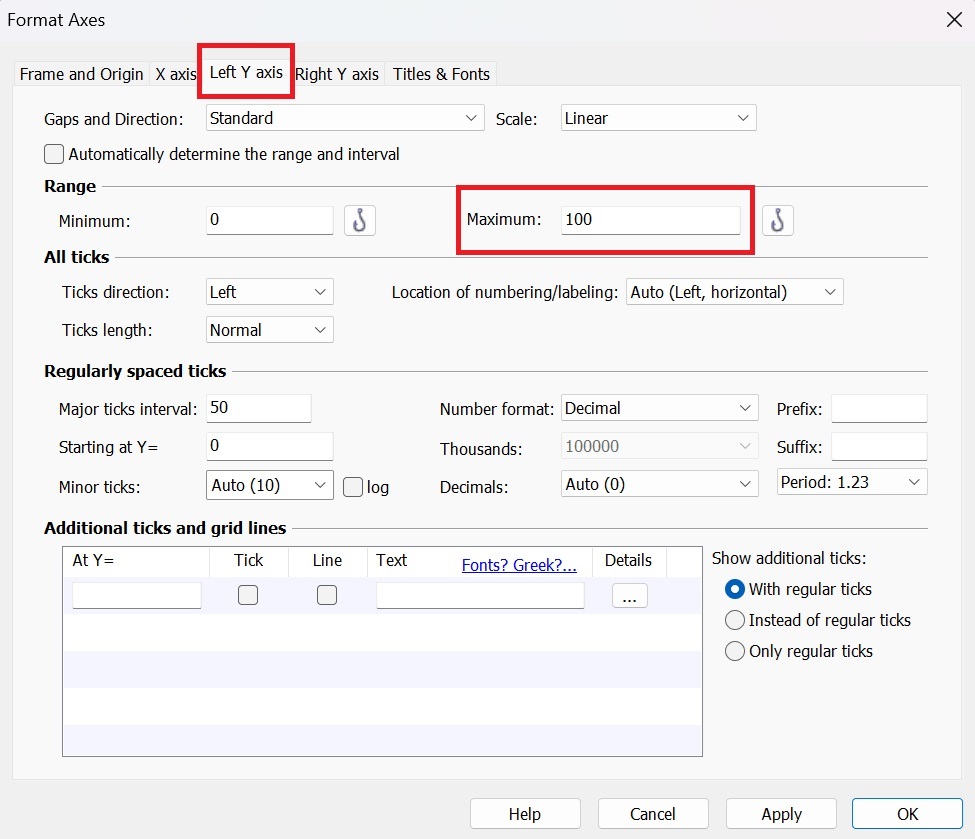 5、添加Y軸參考線:雙擊圖形Y軸,在“Additionalticks and grid lines”中寫入50,點選Tick/Line在Details按鈕中選擇參考線的顏色和線型即可。
