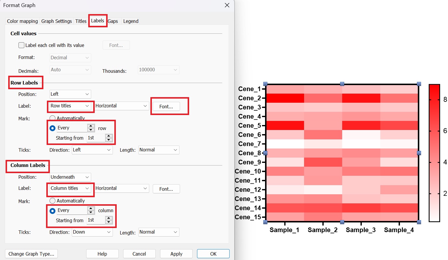 4.2 坐標(biāo)設(shè)置:在Format Graph窗口中點擊“Labels”,“Row Labels”中修改橫坐標(biāo)標(biāo)簽信息,Mark選項選擇“Every”,可以在“Font”中修改字體;“Column Labels”修改如同“Row Labels”。修改后點擊“Apply”。(圖4-2)