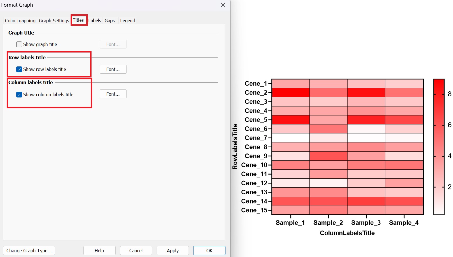 4.4 顯示坐標(biāo)標(biāo)題:切換至“Titles”選項卡,勾選“Show row labels title”和“Show column labels title”即可。(圖4-4)