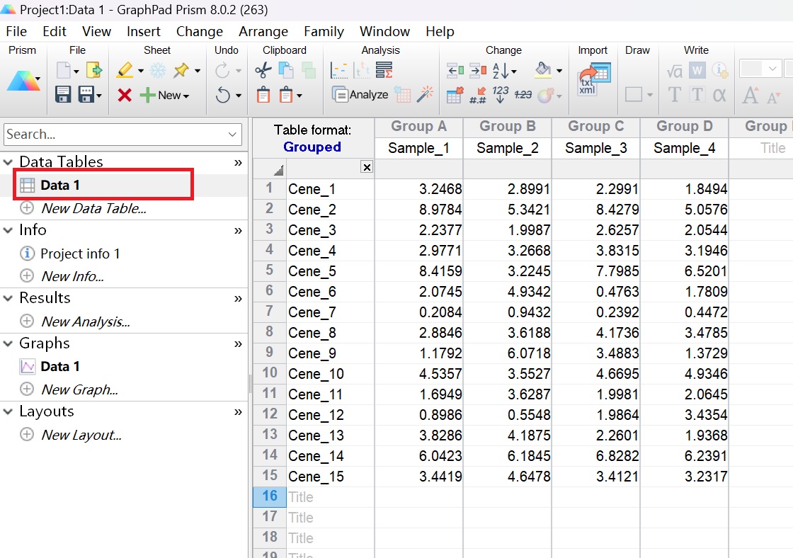 熱圖(Heatmaps)是將數(shù)據(jù)矩陣中的各個值按一定規(guī)律映射為顏色來進(jìn)行展示,利用顏色變化實現(xiàn)數(shù)據(jù)的可視化。通過熱圖,我們可以快速地了解數(shù)據(jù)的分布規(guī)律、熱點區(qū)域以及密度變化情況,為圖像分析提供直觀的參考依據(jù)。根據(jù)下列范例數(shù)據(jù)(范例數(shù)據(jù)為隨機(jī)數(shù)據(jù),無生物學(xué)意義),利用GraphPad Prism軟件繪制熱圖。