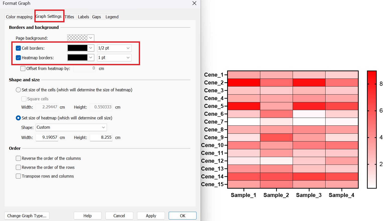4.3 熱圖邊框修改:切換至Graph Settings選項卡,修改Heatmap borders的粗細(xì)為“1 pt”,即熱圖邊框的粗細(xì),也可修改顏色。勾選“Cell borders”可顯示每個單元格的邊框,如圖4-3。