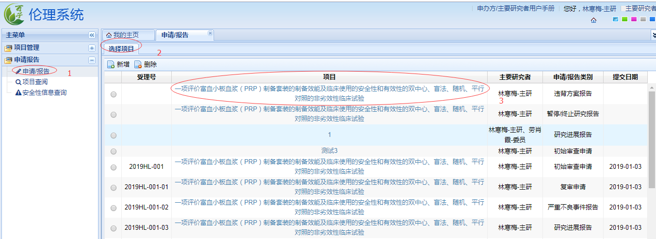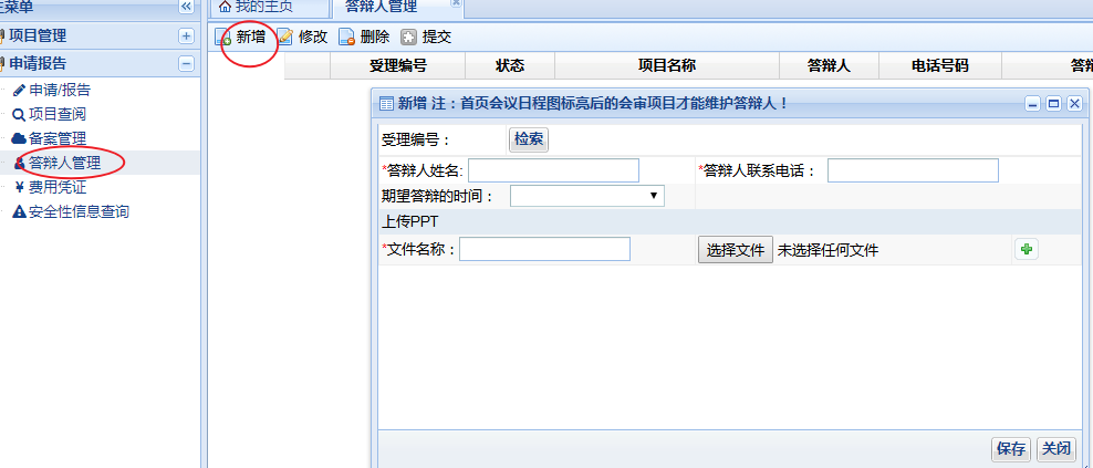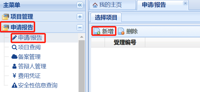 依次點(diǎn)擊下圖中的“申請(qǐng)報(bào)告”、“申請(qǐng)/報(bào)告”、“新增”,并在下拉框中選擇需遞交資料的項(xiàng)目名稱。