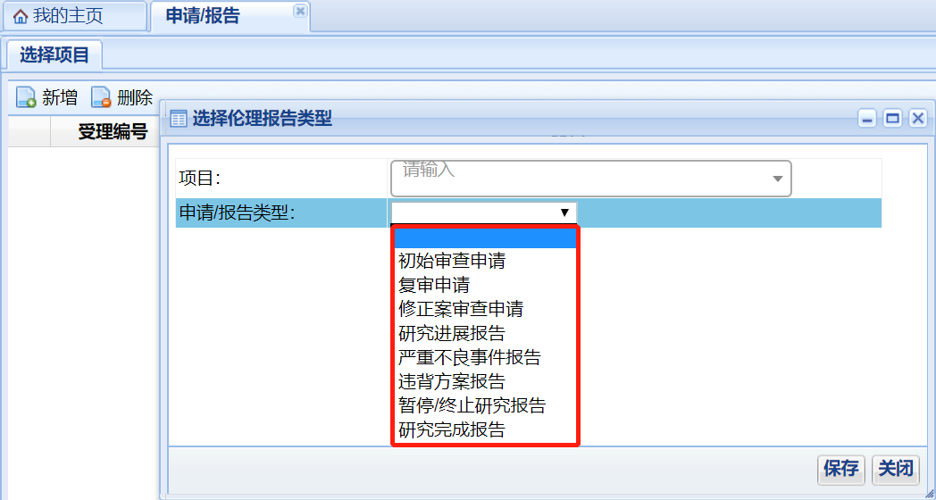在“申請(qǐng)/報(bào)告類型”下拉菜單中選擇所需遞交資料的類型,選擇完畢后點(diǎn)擊“保存”。