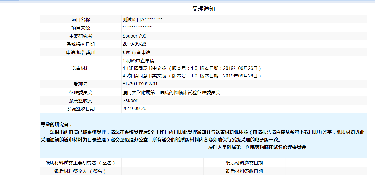 提交資料成功受理會(huì)在我的主頁——待辦事項(xiàng)顯示受理成功通知。點(diǎn)擊“查看”出現(xiàn)受理通知,下載、打印該受理通知,并在項(xiàng)目管理——申請(qǐng)報(bào)告中下載、打印相應(yīng)的申請(qǐng)表及遞交資料清單中的文件,簽字后將紙質(zhì)版材料交至倫理辦公室(5號(hào)樓5019室)。