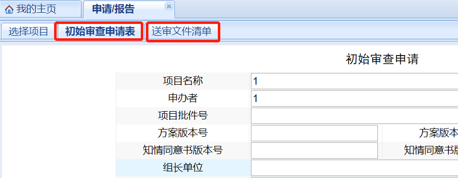 上述操作點(diǎn)擊“保存”后系統(tǒng)將出現(xiàn)相應(yīng)的審查申請(qǐng)表及送審文件清單,如:若選擇的是“初始審查申請(qǐng)”則系統(tǒng)會(huì)跳出“初始審查申請(qǐng)表”并出現(xiàn)“送審資料清單”。