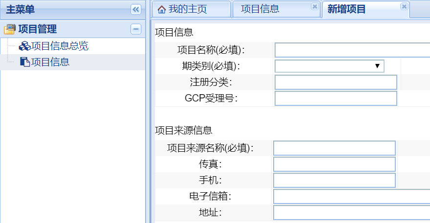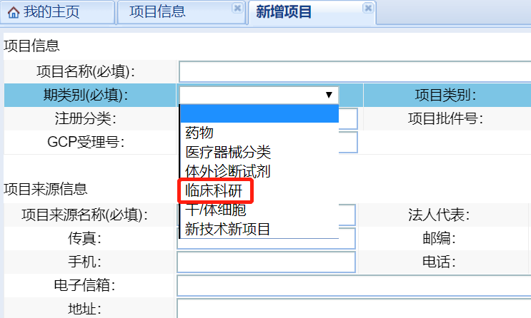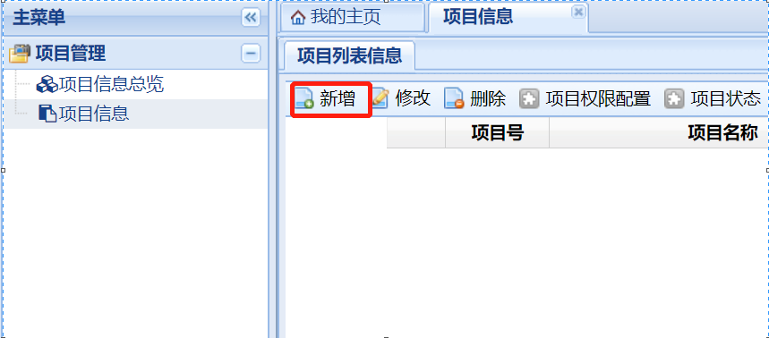 權(quán)限開通后,在下列界面點(diǎn)擊“項(xiàng)目信息”,在“項(xiàng)目列表信息”下點(diǎn)擊“新增”進(jìn)入新增項(xiàng)目的項(xiàng)目信息填寫界面,請(qǐng)按表格要求完善項(xiàng)目信息,以利于倫理委員會(huì)對(duì)項(xiàng)目的管理。